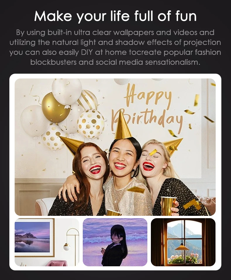 By using built-in ultra clear wallpapers and videos, and utilizing the natural light and shadow effects of projection, you can also easily DIY at home to create popular fashion blockbusters and social media sensationalism.